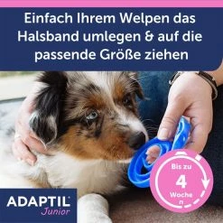 Adaptil Junior ist ein Halsband, das beruhigende Pheromone an Ihren Welpen abgibt. Mutterhündinnen produzieren dieses Pheromon auch, damit sich ihre Welpen wohlfühlen. Das hilft Ihrem Welpen, sich an die neue Familie und sein neues Zuhause zu gewöhnen und neue Eindrücke entspannter aufzunehmen. Um Ihrem Welpen beizubringen, mit unbekannten Situationen umzugehen, ist es ratsam, das Tragen des Halsbandes über die gesamte Sozialisierungsphase (6 Monate) fortzusetzen. Es ist wichtig, bei einer Besserung das Halsband für einen weiteren Monat zu tragen.