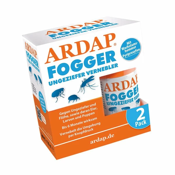 Der ARDAP Fogger enthält die Wirkstoffe Permethrin, Pyrethrum und Pyriproxyfen sowie Piperonylbutoxid als Synergist. Permethrin und Pyrethrum töten das Ungeziefer schnell und zuverlässig ab, während Pyriproxyfen (Wachstumshemmer) den biologischen Entwicklungszyklus unterbricht. Somit werden alle Stadien der Entwicklung über 6 Monate lang wirksam bekämpft.
