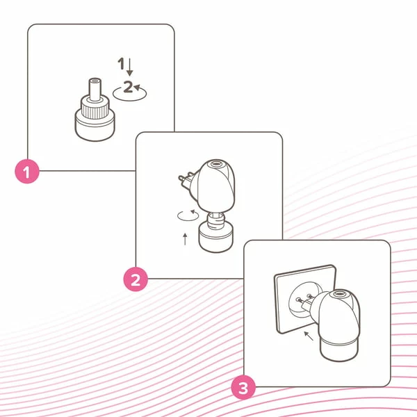 Verwende das Gerät nur in Verbindung mit einer 230V Steckdose. Verwende keine Mehrfachsteckdose, Verlängerungskabel, Adapter oder Konverter. Vor Gebrauch beiliegende Gebrauchsanweisung lesen und beachten. Ein 48ml Flakon reicht bis zu 30 Tage und für 70m².