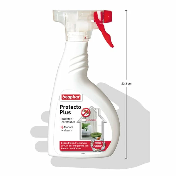 Beaphar Protecto Plus ein raumgreifender ZerstĂ€uber mit doppeltem Wirkprinzip: Ausgewachsene Flöhe sterben sofort ab. Die Entwicklung vom Ei zur Larve wird durch den Wirkstoff S-Methopren gestoppt. Dadurch wird die Vermehrung der Flöhe verhindert. Das (un)sichtbare Problem. Die Anzahl der sichtbaren Flöhe ist nur die Spitze des âFlohbergsâ. Lediglich ca. 5 % einer Flohpopulation leben auf dem Wirt. Die ĂŒbrigen 95 % verteilen sich als Eier, Larven oder Puppen unsichtbar in der Umgebung ihrer Wirtstiere, weshalb auch die Umgebung mit entsprechenden Produkten behandelt werden sollte. Protecto Fogger (Vernebler) wirkt auch gegen Zecken, LĂ€use, Herbstgrasmilben, Haarlinge, Kakerlaken usw.