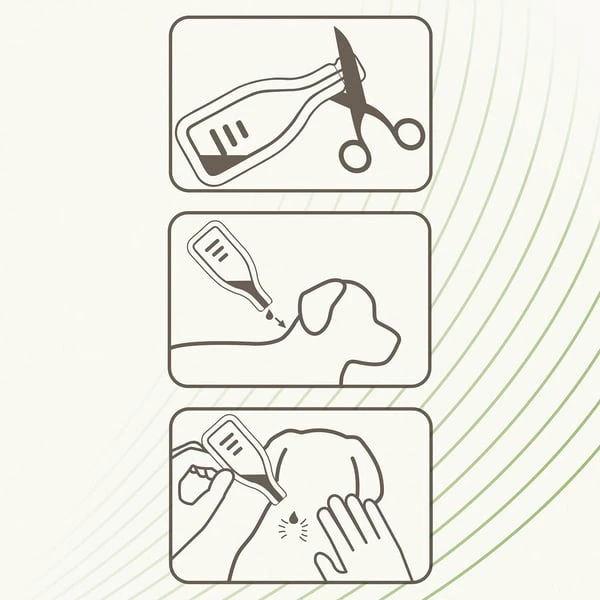 Eine Tube pro Hund: Der Tubeninhalt wird im Nacken des Hundes aufgetragen, die Wirkung tritt sofort ein. Darauf achten, dass das Präparat nicht aufgeleckt werden kann. 1x pro Monat die Anwendung wiederholen.