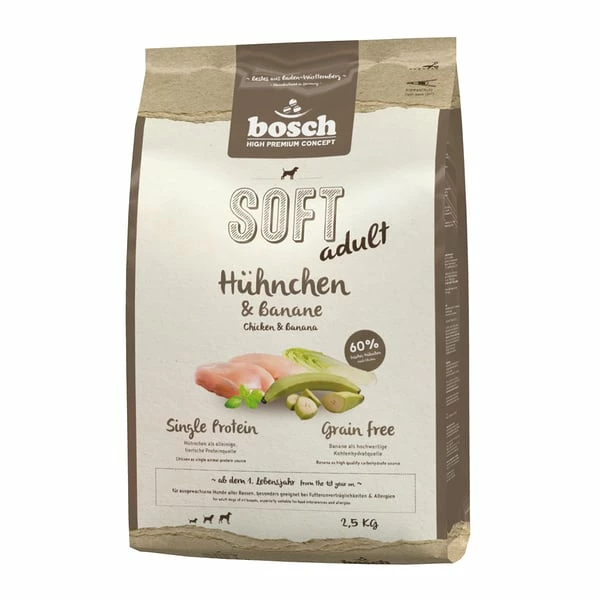Frisches Huhn (min. 60 %), Kartoffelstärke, Kochbanane (getrocknet, min. 8 %), Kartoffeleiweiß, Proteinhydrolysat (pflanzlich), Erbsen (getrocknet), Zellulosefasern, Flohsamenschalen, Chicoreepulver, Hefe (getrocknet), Natriumchlorid, Glucosamine, Chondroitinsulfat, Yucca-Extrakt.
