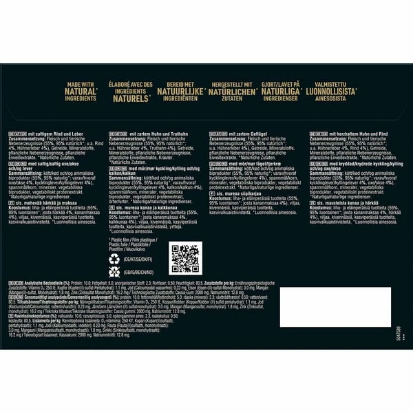 mit saftigem Rind und Leber – Zusammensetzung: Fleisch und tierische Nebenerzeugnisse (55%, natürlich* 95%, u.a. Rind 4%, u.a. Hühnerleber 4%), Getreide, Mineralstoffe, pflanzliche Nebenerzeugnisse, pflanzliche Eiweißextrakte. * Natürliche Zutaten. # mit zartem Huhn und Truthahn – Zusammensetzung: Fleisch und tierische Nebenerzeugnisse (55%, natürlich* 95%, u.a. Hühnerleber 4%, u.a. Truthahn 4%), Getreide, Mineralstoffe, pflanzliche Nebenerzeugnisse, pflanzliche Eiweißextrakte, Kräuter. * Natürliche Zutaten. # mit zartem Geflügel – Zusammensetzung: Fleisch und tierische Nebenerzeugnisse (55%, natürlich* 95%, u.a. Hühnerleber 4%), Getreide, Mineralstoffe, pflanzliche Nebenerzeugnisse, pflanzliche Eiweißextrakte. * Natürliche Zutaten. # mit herzhaftem Huhn und Rind – Zusammensetzung: Fleisch und tierische Nebenerzeugnisse (55%, natürlich* 95%, u.a. Hühnerleber 4%, u.a. Rind 4%), Getreide, Mineralstoffe, pflanzliche Nebenerzeugnisse, pflanzliche Eiweißextrakte. * Natürliche Zutaten.