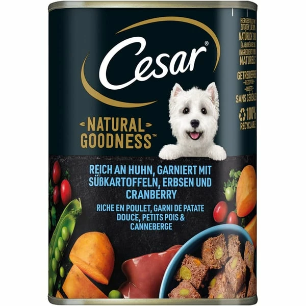 Fleisch und tierische Nebenerzeugnisse* (57%, u.a. Huhn 10% und Hühnerleber 4%), Gemüse* (u.a. getrocknete Erbsen 0.75%, das entspricht Erbsen 2.6%, getrocknete Karotten 0.62%, das entspricht Karotten 4.8% und getrocknete Süßkartoffeln 0.25%, das entspricht Süßkartoffeln 0.81%), pflanzliche Nebenerzeugnisse*, Mineralstoffe, Rosmarin*, Petersilie*, Früchte* (Cranberryextrakt 0.01%). *natürliche Zutaten.