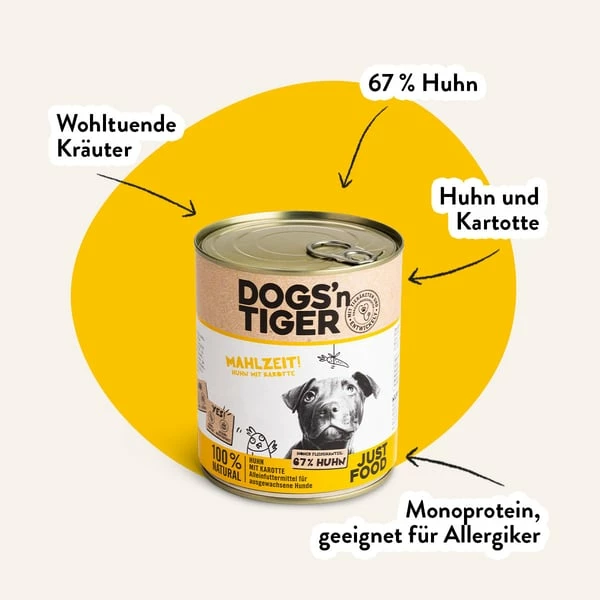 67% bestehend aus Hühnerherzen, Hühnerfleisch, Hühnerlebern, Hühnermägen, Hühnerhälsen, 27,3% Brühe, 4% Karotten, 1% Mineralstoffe, 0,5% bestehend aus Fenchel, Ringelblume, Brennnesselkraut, Schafgarbenkraut, Löwenzahnkraut, Spitzwegerichblatt, Löwenzahnwurzel, Johanniskraut, 0,2% Leinöl