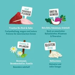 *Zu 100 % aus kontrolliert ökologischer Landwirtschaft. Frisches Bio-Huhn* 25 %, Bio-Vollkornreis*, Bio-Reisprotein*, Bio-Vollkornhirse*, frisches Bio-Rind* 5 %, Bio-HĂŒhnerfett*, Bio-SchweinesoĂe*, Mineralstoffe, Bio-Tomaten* 0,04 %, Bio-Karotten* 0,04 %, Bio-Rote-Bete* 0,04 %, Bio-GrĂŒnkohl* 0,04 %, Bio-Kokosnuss* 0,04 %, Bio-Nesseln*, Bio-BrombeerblĂ€tter*, Bio-Fenchel*, Bio-KĂŒmmel*, Bio-Kamille*, Bio-Melisse*.