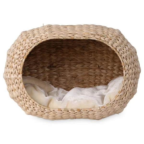 Ein flauschiger PlĂŒschbezug macht die Höhle zum besonders weichen und warmen Ort. Aus Wasserhyazinte gefertigt, ist die Höhle nicht nur zweckmĂ€Ăig, sondern macht auch optisch einen guten Eindruck.