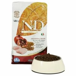 Frisches Hühnchenfleisch ohne Knochen (24%), Hühnchentrockenfleisch (24%), Dinkel (10%), Hafer (10%), Hühnerfett, Trockenei, frischer grätenfreier Hering, getrockneter Hering, Fischöl, hydrolysiert tierisches Eiweiß, getrocknete Rübenschnitzel, Erbsenfasern, getrocknete Möhren, getrocknete Luzerne, Inulin, Fruktooligosacharide, Mannan-oligosacharide, getrockneter Granatapfel (0.5%), getrockneter Apfel, getrockneter Spinat, Psyllium (0.3%), getrocknete schwarze Johannisbeere, getrocknete Süßorange, getrocknete Heidelbeere, Natriumchlorid, getrocknete Bierhefe, Kurkumawurzeln (0.2%), Glukosamin, Chondroitin-sulfat, Tagetesblütenmehl (Quelle für Lutein)