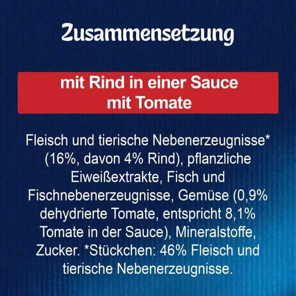 Fleisch und tierische Nebenerzeugnisse* (16%, davon 4% Rind), pflanzliche EiweiĂextrakte, Fisch und Fischnebenerzeugnisse, GemĂŒse (2,4% Tomatenkonzentrat, entspricht 4% Tomate in der SoĂe), Mineralstoffe, Zucker.