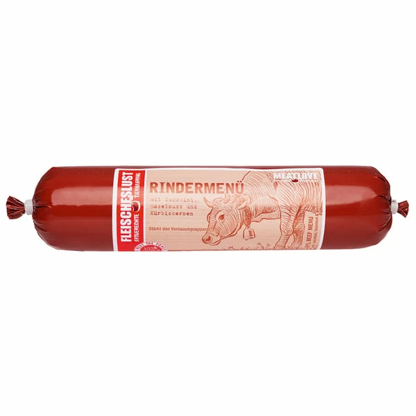80% Rindfleisch und Innereien (30% Rindfleisch, 25% Rinderpansen, 15% Rinderlunge, 6% Rinderherz, 4% Rinderleber), 12,1% Zucchini, Haselnuss gemahlen, Kürbiskern gemahlen, Sonnenblumenöl, Meersalz, Eierschalenpulver, Heilerde, Yuccawurzelextrakt