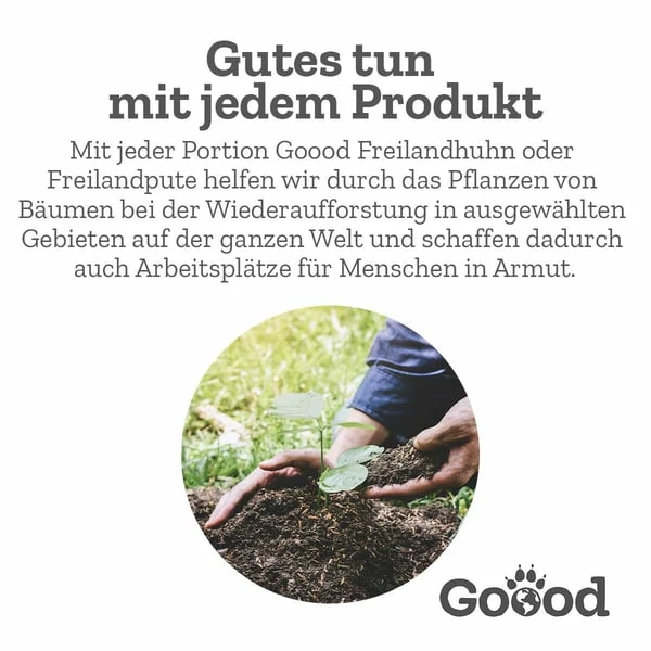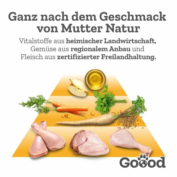 Pute (gesamt 85,2 %, bestehend aus Putenfleisch, Putenherz, Putenleber, Putenmagen, Putenbrusthaut, Putenhals), Pastinake (8%), Äpfel (3%), Gerste (3%), Petersilie (0,5 %), Präbiotika (=Topinamburkonzentrat (0,3 %))