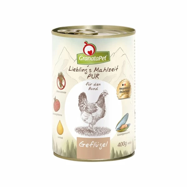 Geflügelfleisch 70% (bestehend aus Muskelfleisch vom Geflügel, Geflügelherz, Geflügelleber, Geflügellunge, Geflügelmagen), Fleischbrühe, Granatapfelkerne 1% (getrocknet und fein vermahlen), Mineralstoffe, Lachsöl 0,5%, Grünlippmuschel (0,1%, fein vermahlen, von Natur aus reich an Glucosamin und Chondroitin)