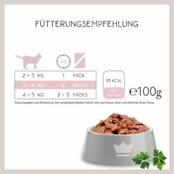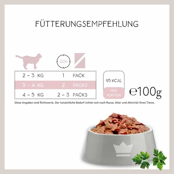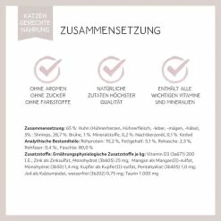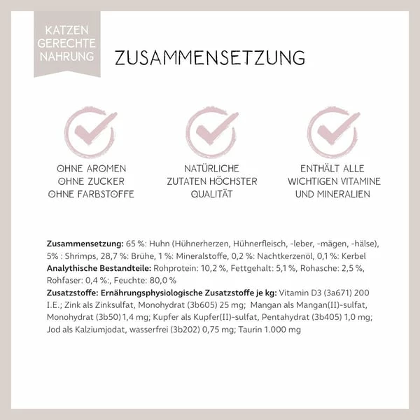 65%: Huhn (HĂŒhnerherzen,HĂŒhnerfleisch, -leber, -mĂ€gen, -hĂ€lse), 5%: Shrimps, 28,7%: BrĂŒhe, 1%: Mineralstoffe, 0,2%: Nachtkerzenöl, 0,1%: Kerbel