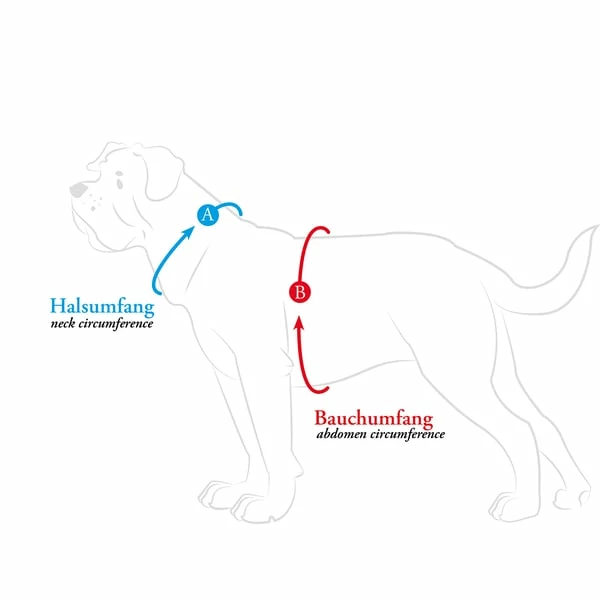 Idealerweise messen Sie den Bauchumfang (B) des Hundes knapp hinter den VorderlĂ€ufen an der breitesten Stelle des Brustkorbes mit einem flexiblen MaĂband. Das MaĂband sollte eng anliegen, den Hund aber nicht beengen. Etwa eine Fingerbreite Luft sollte zwischen MaĂband und Hund bleiben. Anhand dieses Umfangs und der BerĂŒcksichtigung des Halsumfangs (A) kann die korrekte Geschirr-GröĂe ermittelt werden. In der Regel sind alle Geschirre mindestens am Bauch, meist aber auch mehrfach verstellbar und können zugunsten des Tragekomforts optimal an jede Körperform angepasst werden.
