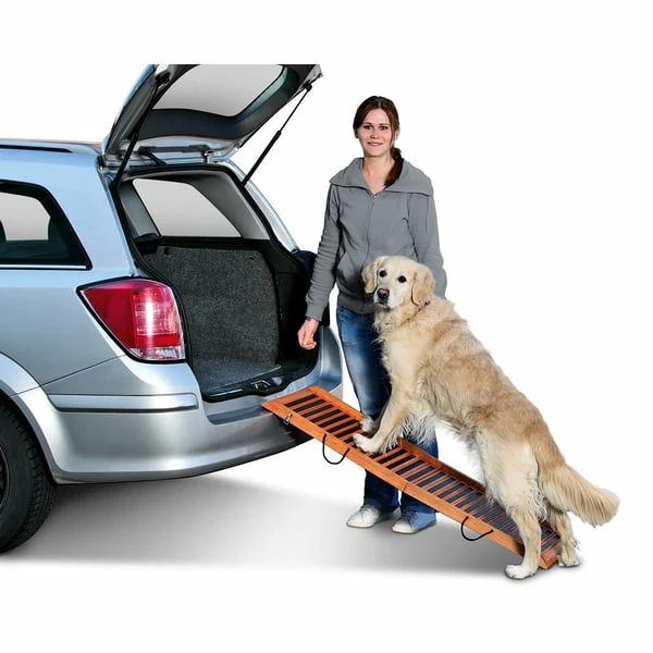 Die praktische Auto-Anlegerampe fĂŒr Hunde ist ideal fĂŒr Welpen, groĂe und schwere Rassen, Seniorenhunde und Hunde in der Rekonvaleszenz. Sie ermöglicht einen bequemen Ein- und Ausstieg und hilft so Gelenke, Muskeln, Sehnen und BĂ€nder zu schonen. Die stabile Holzrampe ist bis 50 kg belastbar. Eine beschichtete Anti-Rutsch-TrittflĂ€che sorgt dafĂŒr, dass die Pfoten des Hundes auf der Rampe nicht wegrutschen und der Hund sicher in das Auto gelangt. Die Rampe kann platzsparend zusammengelegt und verstaut werden. Es ist keine Montage nötig. Die Rampe wird einfach auseinandergeklappt und an die StoĂstange angelegt.