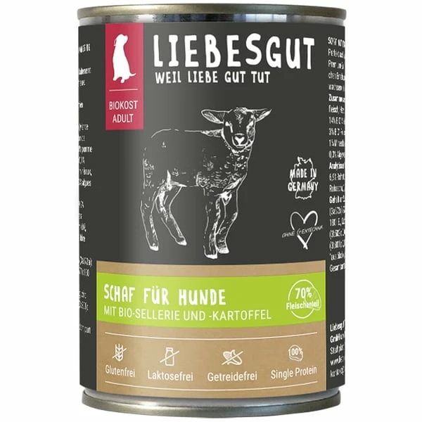 70% BIO-Schaf (Muskelfleisch, Herz, Lunge), BIO-Schaffleischbru?he, 14% BIO-Sellerie, 10% BIO-Kartoffeln, 3% BIO-Fenchel, 1% BIO-Chiasamen, 1% BIO-Nachtkerzenöl, 1% BIO-Eierschale