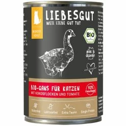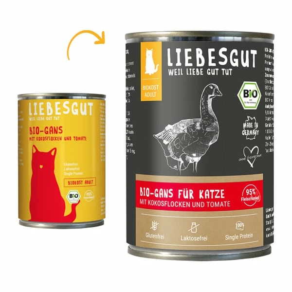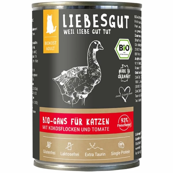 95% Bio-Gans (Brustfleisch, Hals und Karkasse), Bio-GĂ€nsefleischbrĂŒhe, 2% Bio-Kokosflocken, 2% Bio-Tomate, 1% Bio-Hirse