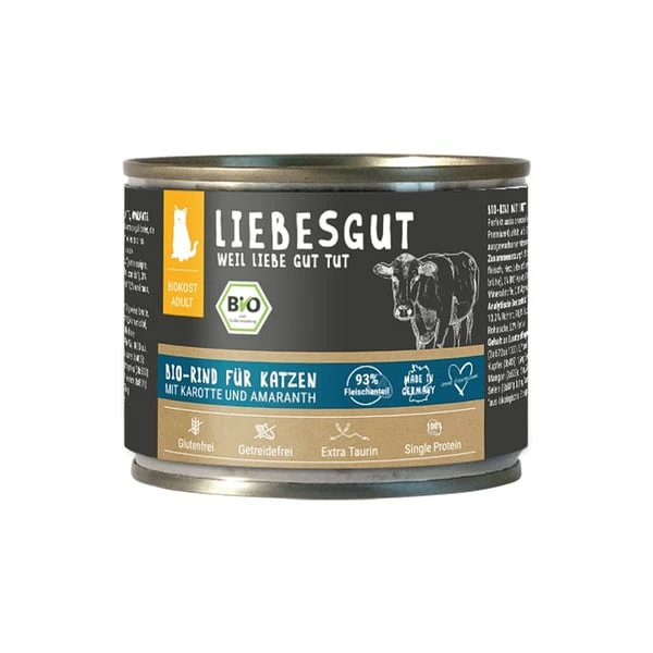 Entdecke Bio-Nassfutter für deine Katze. Erstklassiges Futter füllst du mit Liebesgut Biokost Adult Katze mit Rind, Karotten und Amaranth in den Napf. Die Zutaten besteht aus biologischen Bestandteilen. Proteinreiches Rind ist ein Hochgenuss für dein Tier. Das Futter ist speziell auf die Bedürfnisse von ausgewachsenen Katzen angepasst. Genug Energie für den Tag bekommt dein Liebling durch die hochwertigen Proteine, welche im hohen Fleischanteil und insbesondere im enthalten sind. Dieses proteinreiche Katzenfutter eignet sich vor allem, um den Eiweiß- und Energiebedarf einer aktiven Katze abzudecken. Zusätzlich liefert das enthaltene Herz viel hochwertiges Protein. Das Nassfutter verzichtet auf Gluten und Getreide und besitzt nur eine tierische Proteinquelle. Es ist besonders für Katzen, die ernährungssensibel sind und zu Unverträglichkeiten neigen, empfehlenswert. Eine adäquate Versorgung mit der Aminosäure Taurin ist essentiell für Herz und Stoffwechsel deiner Katze. Liebesgut Biokost Adult Katze mit Rind, Karotten und Amaranth unterstützt bei der ausreichenden Versorgung mit Taurin, da es nur in geringen Mengen von der Katze selbst erzeugt werden kann. Als Superfood gilt die beigefügte Zutat: Amaranth, welche sich positiv auf die Gesundheit auswirken kann.