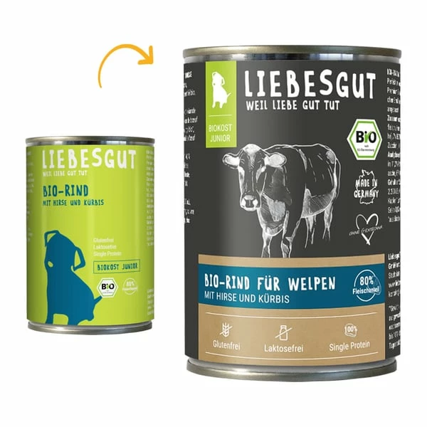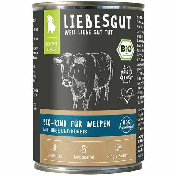 Für eine ausgewogene Mahlzeit deines Hundes kannst du mit diesem schmackhaften Nassfutter sorgen. Liebesgut Biokost Junior Hund mit Rind, Hirse und Kürbis ist ein vorzügliches Futter. Die biologischen Bestandteile bieten die besten Zutaten bei der Futterwahl. Für einen guten Appettit sorgt hochwertiges Rind. Das Futter ist speziell auf die Bedürfnisse von jungen Hunden angepasst. Der Energiebedarf von jungen Hunde und ausgewachsenen Hunden unterscheidet sich voneinander. Daher ist es wichtig, Jungtiere mit einem speziellen Futter zu versorgen, welches auf ihre Bedürfnisse abgestimmt ist.
