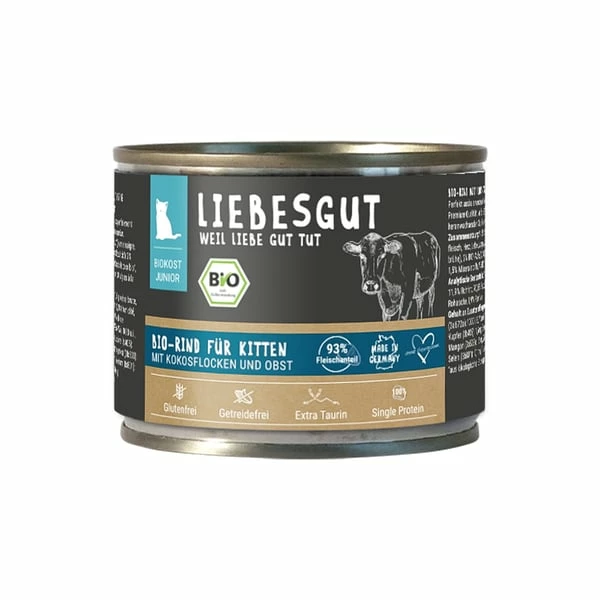 Mache deiner Katze eine Freude mit Bio-Nassfutter. Liebesgut Biokost Junior Katze mit Rind, Kokos und Obst verwöhnt auch den zartesten Gaumen. Dank der biologischen Zusammensetzung bietet dir Liebesgut die besten Zutaten bei der Futterwahl. Wohlschmeckendes Rind lässt das Herz deines Tieres höher schlagen. Das Futter ist speziell auf die Bedürfnisse von jungen Katzen angepasst. Da sie noch im Wachstum sind, haben einen anderen Energiebedarf als ausgewachsene Tiere. Juniorfutter berücksichtigt diese Anorderungen und versorgt deinen kleinen Vierbeiner mit wichtigen Nährstoffen.