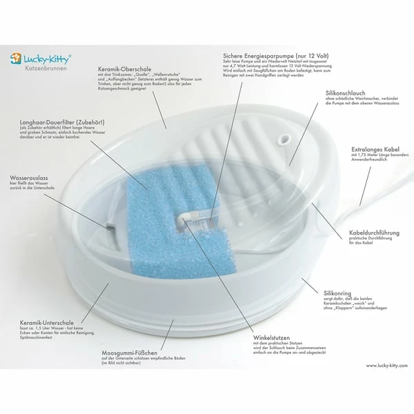 Der Lucky-Kitty Katzenbrunnen aus Keramik ist ein innovativer Trinkbrunnen, welcher speziell für Katzen entwickelt wurde. Er ermuntert deine Fellnase mit seinen unterschiedlichen Trinkzonen dazu, ausreichend Wasser zu trinken. Das kann potenziell dazu beitragen, Nierenerkrankungen vorzubeugen. Sowohl Menschen als auch Katzen schätzen den Trinkbrunnen sehr, da er für den sicheren Dauerbetrieb im Alltag entwickelt wurde. Aufgrund seiner keramischen Beschaffenheit lässt er sich äußerst einfach und blitzschnell reinigen. Darüber hinaus verfügt er über eine super leise, energiesparende Qualitätspumpe und ist selbst von kräftigen Katzen nicht zu verschieben, umzuwerfen oder zu öffnen. Wusstest Du, dass Katzen besonders gerne fließendes Wasser trinken? Wenn sie nur stehendes Wasser aus ihrem Napf bekommen, trinken sie oft zu wenig, was auf lange Sicht negative Folgen für ihre Gesundheit haben kann. Dies gilt insbesondere im Winter, wenn die Heizungsluft trocken ist oder wenn sie Trockenfutter und Leckerlis bekommen.
