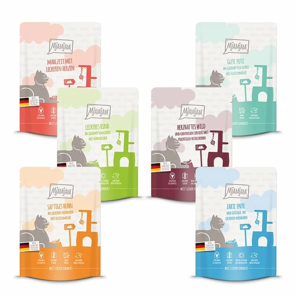 Hühnerfleisch, -leber, -herzen (72,5%), Fleischbrühe (22,4%), Möhrchen (4%), Mineralstoffe (1%), Katzenminze (0,1%).