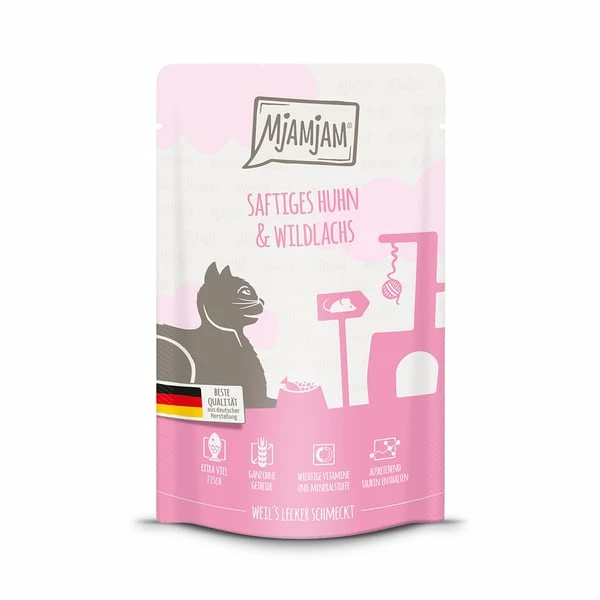 Huhn (45%), Fleisch und Lachs Brühe (28%), Lachs (26%), Mineralstoffe (0,5%), Eierschalenpulver (0,5%)