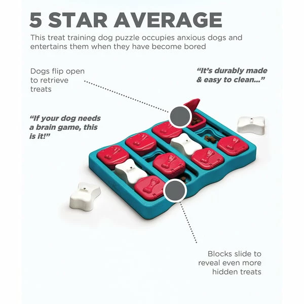 Das Hunde-Denkspielzeug Dog Brick mit Level 2 von Nina Ottosson by Outward Hound wird deinen Hund stundenlang beschäftigen, da er seine natürlichen Jagdinstinkte ausleben kann, um die verdeckten Leckerlis aufzuspüren. Das Spielzeug hat drei einfach befüllbare Fächer, in denen die Lieblingsleckerlis und -snacks deines Hundes versteckt werden können. Die Teile mit aufklappbarem Deckel lassen sich öffnen und beherbergen das erste Fach zum Verstecken der Leckerlis. Sie können auch verschoben werden, sodass das zweite Fach darunter aufgedeckt wird. Die weißen hohlen Teile in Knochen-Form beherbergen das dritte Fach und lassen sich problemlos herausnehmen, um leckere Snacks zu verstecken. Dieses Denkspielzeug ist ideal für Welpen, die schon Level 1 der Spielzeug-Linie von Nina Ottosson gemeistert haben und bereit für die nächste Stufe sind. Hergestellt aus robusten und herausnehmbaren Kunststoffteilen und lebensmittelechten Materialien, die frei von BPA, PVC und Phthalaten sind. Reinigung von Hand mit Spülmittel und Wasser.