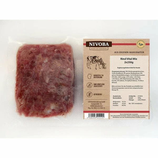 24 % Rinderspangenknochen, 22,8 % Rindfleisch, 8 % grüner Rinderpansen, 8 % grüner Rinderblättermagen, 16,2 % Rinderinnereien (5 % Milz, 4,8 % Lunge, 3,2 % Leber, 1,6 % Herz, 1,6 % Niere), 20 % Obst/Gemüse (6 % Salat, 5 % Karotte, 4 % Sellerie, 3 % Apfel,2 % Birne), 1 % Mirco Mineral
