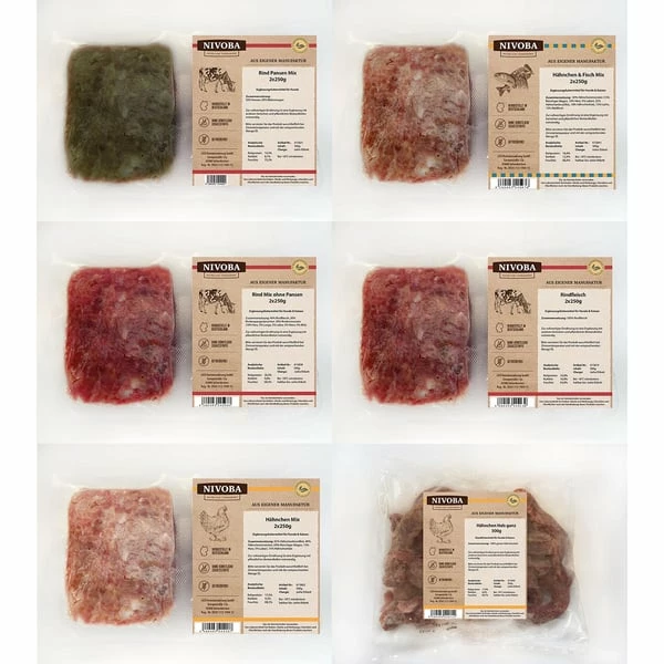 Rind Mix ohne Pansen: Feuchte 68,5 %, Asche 2,1 %, Fett 9,8 %, Protein 20,2 %, Faser 0,3 %, Phosphor 0,26 %, Calcium 0,18 %