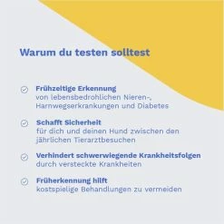 So wie wir unsere regelmäßigen Gesundheitschecks machen, muss das umso mehr bei Hunden stattfinden! Hunde zeigen bei Krankheiten sehr spät Symptome, daher ist das regelmäßige Testen relevanter Bestandteil der Gesundheitsvorsorge. Das hilft dem Tierarzt früher und schneller zu handeln. Wir empfehlen vier Tests pro Jahr für die optimale Früherkennung und Vorsorge von zuhause.