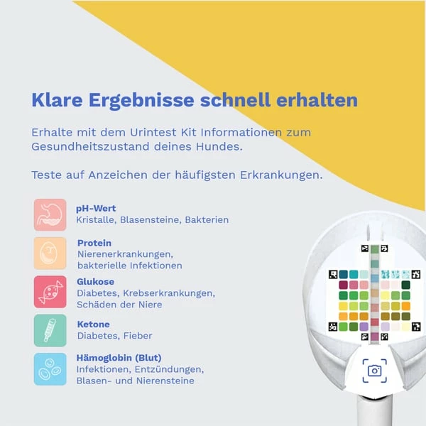 Teste mit dem All-in-One Urintest Kit zuhause, stressfrei und ohne lange Wartezeiten. Erkenne mit regelmäßigen Tests viele der häufigsten Hundekrankheiten frühzeitig. Erhalte dein Ergebnis einfach erklärt und von unserem Fachpersonal geprüft innerhalb weniger Minuten in der kostenlosen Pezz-App.