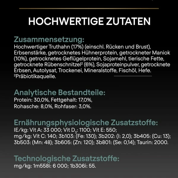 Hochwertiger Truthahn (17%) (einschl. Rücken und Brust), Erbsenstärke, getrocknetes Hühnerprotein, getrockneter Maniok (10%), getrocknetes Geflügelprotein, Sojamehl, tierische Fette, getrocknete Rübenschnitzel2 (6%), Sojaproteinpulver, getrocknete Erbsen, Autolysat, Trockenei, Mineralstoffe, Fischöl, Hefe. 2Präbiotikaquelle.