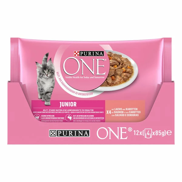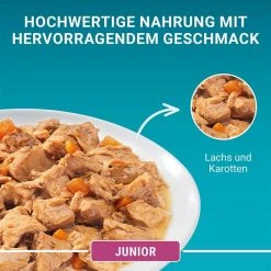 Fleisch und tierische Nebenerzeugnisse, pflanzliche EiweiĂźextrakte, Fisch und Fischnebenerzeugnisse (4% Lachs), Ă–le und Fette, Mineralstoffe, pflanzliche Nebenerzeugnisse, GemĂĽse (0,6% dehydrierte Karotten, entspricht 5,4% Karotten), Zucker.