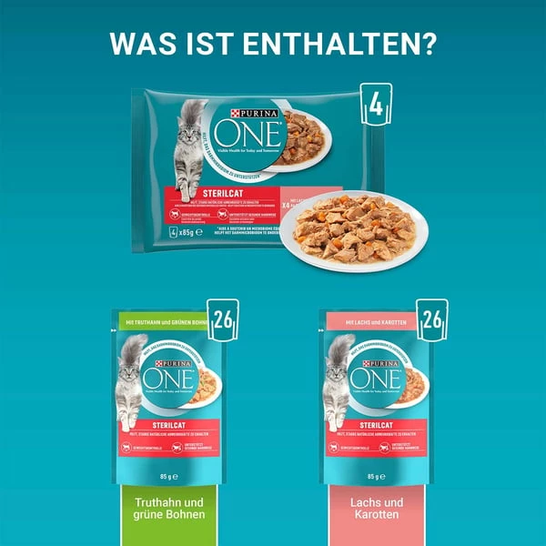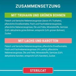 Fleisch und tierische Nebenerzeugnisse, pflanzliche EiweiĂźextrakte, Fisch und Fischnebenerzeugnisse (4% Lachs), pflanzliche Nebenerzeugnisse (0,55% Inulin), Ă–le und Fette, Mineralstoffe, GemĂĽse (0,6% dehydrierte Karotten, entspricht 5,4% Karotten), Zucker.