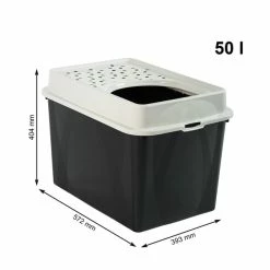 Moderne Katzentoilette mit obenliegendem Einstieg. Dank grosszügiger Öffnung auch für grosse Katzenrassen geeignet. Der Behälter ist breit und tief, so dass jede Katze ihren Platz finden kann. Die hohen Seitenwände garantieren Auslaufschutz und sorgen für deutlich weniger Katzenstreu rund um die Toilette Die Abdeckung ist so gestalltet, dass Streureste von den Pfoten Ihrer Katze wieder im Behälter landen. Der Deckel kann zur einfachen Reinigung vom Behälter abgenommen werden.