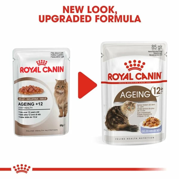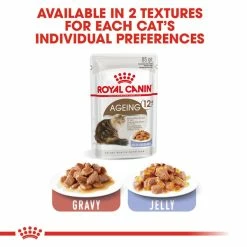ROYAL CANIN Ageing 12+ ist al Stückchen in Soße, als Stückchen in Gelee oder als Trockenfutter in Form von knusprigen Kroketten erhältlich, um den individuellen Vorlieben verschiedener Katzen gerecht zu werden.
