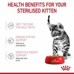 Es enthält außerdem einen moderaten Fettgehalt, um das Risiko einer Gewichtszunahme zu verringern, und weist gleichzeitig einen optimalen Gehalt an Proteinen, Kalzium und Phosphor für ein gesundes Wachstum auf. Die Rezeptur enthält außerdem Nährstoffe wie Vitamin C und E, um die Entwicklung von gesunden körpereigenen Abwehrkräften der Kätzchen zu unterstützen. Diese diätetischen Antioxidantien stimulieren nachweislich einen höheren und schnelleren Anstieg der Antikörper nach einer Impfung. Dank einer Kombination aus nützlichen Präbiotika (MOS) und hochverdaulichen Proteinen trägt ROYAL CANIN® Sterilised Kitten in Soße auch zu einem gesunden Gleichgewicht der Darmflora bei und sorgt so für eine gute Verdauung.
