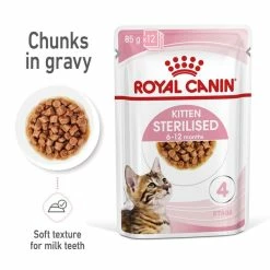 ROYAL CANIN® Sterilised Kitten in Soße wurde speziell für die Ernährungsbedürfnisse von kastrierten Kätzchen in der „Entwöhnungsphase“ ihres Wachstums entwickelt. Diese Rezeptur ist für 6 bis 12 Monate alte kastrierte Kätzchen geeignet, da sie zu dem Zeitpunkt eine bedeutende Phase durchlaufen, in der sich der Körper und das Verhalten verändert. Diese maßgeschneiderte Nahrung bietet feuchte Stückchen in Soße, die eine optimale Größe, Textur und einen optimalen Geschmack für heranwachsende Kätzchen aufweisen.