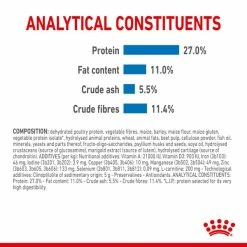 Protein: 27,0 % – Fettgehalt: 11,0 % – Rohasche: 5,5 % – Rohfaser: 11,4 %.