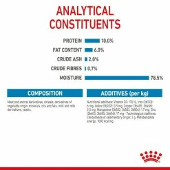 Protein: 10,0% – Fettgehalt: 6,0% – Rohasche: 2,0% – Rohfaser: 0,7% – Feuchtigkeit: 78,5%.