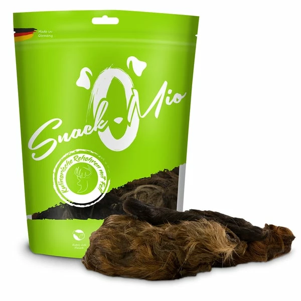 SnackOmio kulinarische Rehohren mit Fell für einen natürlichen und garantierten Kauspaß. SnackOmio ist ein natürlicher Snack, schonend luftgetrocknet, Getreidefrei, Zuckerfrei und ohne chemische Zusätze. Regionale Zutaten für beste Qualität und Verträglichkeit. Durch die wiederverschließbare Verpackung bleibt das Produkt lange frisch. Nach dem Anbruch bitte kühl und trocken lagern.