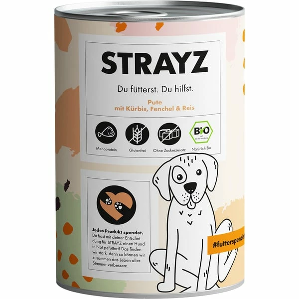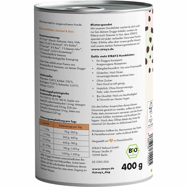 50 % Pute* (ca. 80 % Brustfleisch, ca. 5 % Herzen, ca. 5 % Hälse, ca. 5 % Karkasse, ca. 5 % Leber), 23,45 % Kochsud*, 8 % Kürbis*, 8 % Fenchel*, 8 % Reis*, 1 % Beeren-Mix*, 1 % Mineralstoffe & Vitamine, 0,5 % Leinöl*, 0,05 % Knotentang