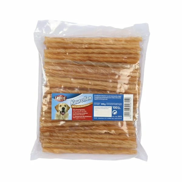 Mache deinem Hund eine Freude mit kalorienarmen Snacks. Trixie 100 Kaurollen aus gedrehter Rinderhaut ø ca. 7-8mm dient wunderbar als Belohnung während eines Trainings mit deinem Liebling. Für einen guten Appettit sorgt leckeres Rind. Der Snack ist für Hunde aller Lebensphasen zu empfehlen. Die besondere Zusammensetzung kann das Risiko von Übergewicht reduzieren und deinem Hund dabei helfen, ein Normalgewicht zu erreichen. Dein Schützling sollte zusätzlich auch zu mehr Bewegung animiert werden.