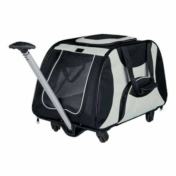 Mit diesem praktischen Trolley reist Ihr Hund oder Ihre Katze komfortabel. Sie können wÀhlen, ob Sie Ihren Liebling darin hinter sich herziehen möchten oder lieber tragen. Denn, wenn man das Fahrwerk abnimmt und den Teleskopgriff komplett versenkt, wird der Trolley aus pflegeleichtem Polyester zur Transporttasche. Eine integrierte Kurzleine verhindert das Herausspringen.