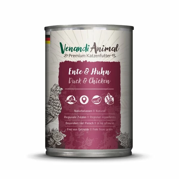 Huhn 56 % (Hühnerfleisch, Hühnermägen, Hühnerleber), Ente 14% (Entenfleisch, Entenhals), Mineralstoffe, Leinöl, Seealgenmehl