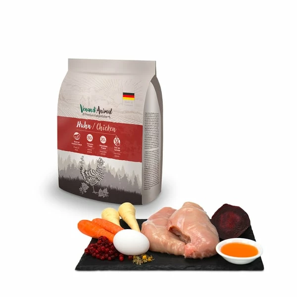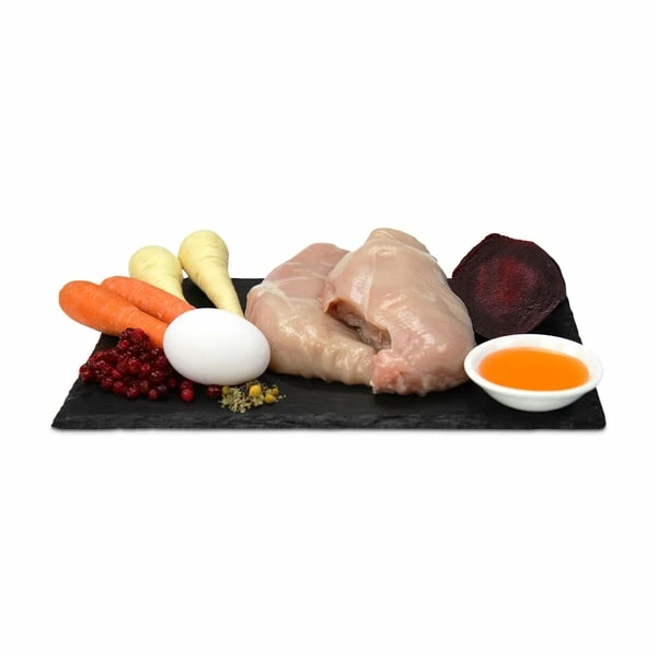 Frisches Hühnerfleisch 25 %; Geflügelprotein (getrocknet) 25 %; Erbsenmehl; Kartoffelstärke; Amaranth; Geflügelleber (getrocknet, hydrolysiert); Geflügelprotein (sprühgetrocknet) 5 %; Bohnenmehl; Geflügelfett; Ei (getrocknet); Bierhefe (getrocknet); Johannisbrotschrot (getrocknet); Leinsaat; Lachsöl 1 %; Gemüse (getrocknet: Pastinake, Karotte, Rote Beete) 0,5 %; Kaliumchlorid; Natriumchlorid; Cranberry 0,2 %; Kräuter (getrocknet: Brennnesselblätter; Brombeerblätter; Kamille; Tausendgüldenkraut;