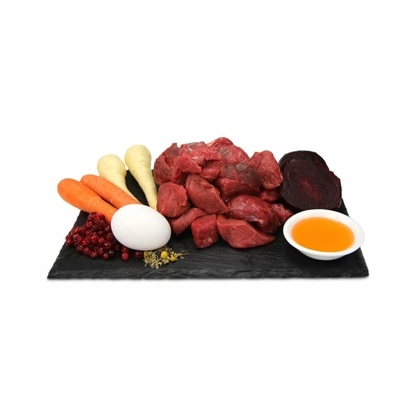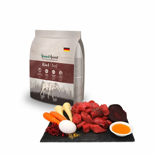 Frisches Rindfleisch 25 %; Geflügelprotein (getrocknet) 20 %; Rinderprotein (getrocknet) 10 %; Erbsenmehl; Kartoffelstärke; Amaranth; Geflügelleber (getrocknet, hydrolysiert); Geflügelfett; Bohnenmehl; Ei (getrocknet); Bierhefe (getrocknet); Johannisbrotschrot (getrocknet); Leinsaat; Lachsöl 1 %; Gemüse (getrocknet: Pastinake, Karotte, Rote Beete) 0,5 %