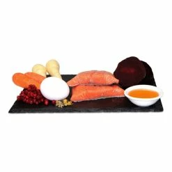 Frischer Lachs 25 %; Geflügelprotein (getrocknet) 24 %; Fischmehl aus Meeresfisch 7,5 %; Erbsenmehl; Kartoffelstärke; Amaranth; Geflügelfett; Bohnenmehl; Meeresfisch (sprühgetrocknet) 4 %; Geflügelleber (hydrolysiert); Ei (getrocknet); Bierhefe (getrocknet); Johannisbrotschrot (getrocknet); Leinsaat; Lachsöl 1 %; Gemüse (getrocknet: Pastinake, Karotte, Rote Beete) 0,5 %; Kaliumchlorid; Cranberry 0,2 %; Kräuter (getrocknet: Brennnesselblätter; Brombeerblätter; Tausendgüldenkraut; Kamille; Schafgarbenkraut) 0,1 %; Chicoree Inulin