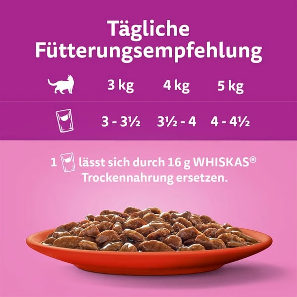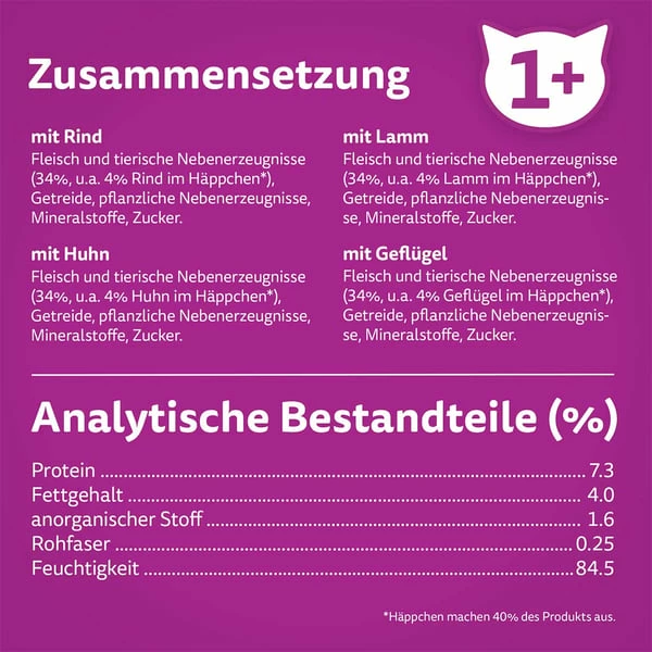 mit GeflĂŒgel: Fleisch und tierische Nebenerzeugnisse (34%, u.a. 4% GeflĂŒgel im HĂ€ppchen*), Getreide, pflanzliche Nebenerzeugnisse, Mineralstoffe, Zucker. *HĂ€ppchen machen 40% des Produkts aus.
